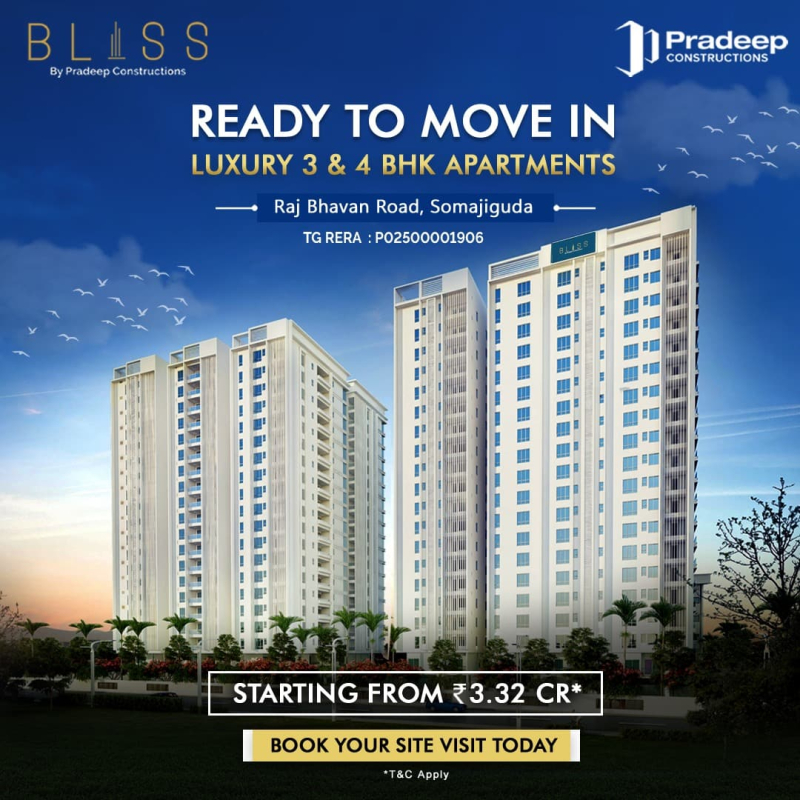 BLISS by Pradeep Constructions offers premium 3 & 4 BHK apartments in Somajiguda, Hyderabad. Prime central location with top connectivity to offices, schools, hospitals, and shopping hubs. Spacious layouts, modern design, and quality construction. Gated community with amenities like clubhouse, gym, security, parking, and landscaped areas. Ideal for families and investment. Limited units available. Book your site visit today.
